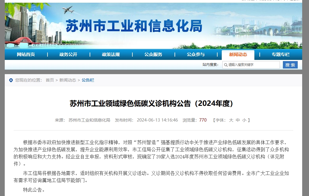 2024年6月13日,《蘇州市工業(yè)領域綠色低碳義診機構(2024年度)》公告發(fā)布。蘇州領跑者能源科技有限公司順利通過遴選,獲得為蘇州市廣大企業(yè)做低碳義診的資格。